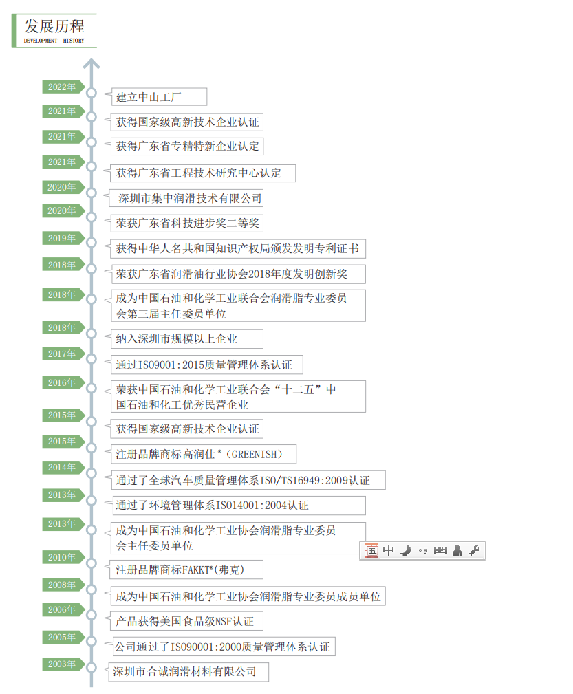 深圳市集中潤滑技術有限公司專業為各行業客戶提供智能集中潤滑方案,公司依托于 1994 年創立的深圳市合誠潤滑材料有限公司,是一家專業從事特種高級環保潤滑油 ( 脂 ) 研發、生產、銷售和服務的高新技術企業 , 公司潤滑油脂產品廣泛應用于汽車部件、精密軸承、機電產品、電子電器、特殊裝配機件等行業。公司產品通過歐盟和美國多項環保標準認證,在中國潤滑油、脂領域享有崇高的聲譽和良好的信譽。
