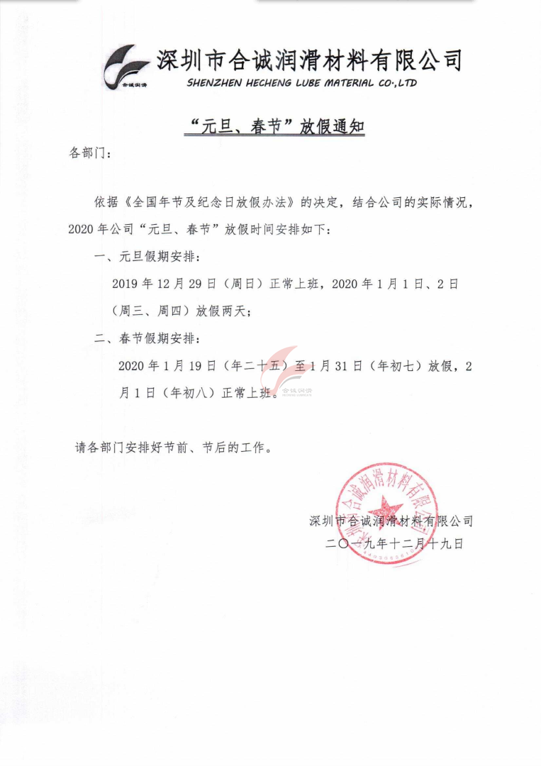 我司將于2019年1月19日至1月31日放假,2月1日正常上班。為保證貴公司的正常運(yùn)作,敬請(qǐng)貴公司安排好春節(jié)前后的訂貨計(jì)劃。謝謝!