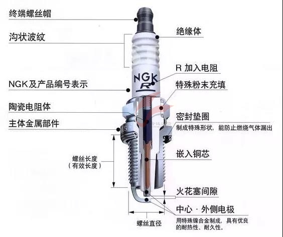 結(jié)構(gòu)并不復雜,用途單一。汽油機點火系統(tǒng)中將高壓電流引入氣缸產(chǎn)生電火花,以點燃可燃混合氣體。火花塞由接線螺母(終端螺絲帽)、絕緣體、陶瓷電阻體、主體金屬部件、中心電極、側(cè)電極等部件組成,側(cè)電極焊接在外殼上。